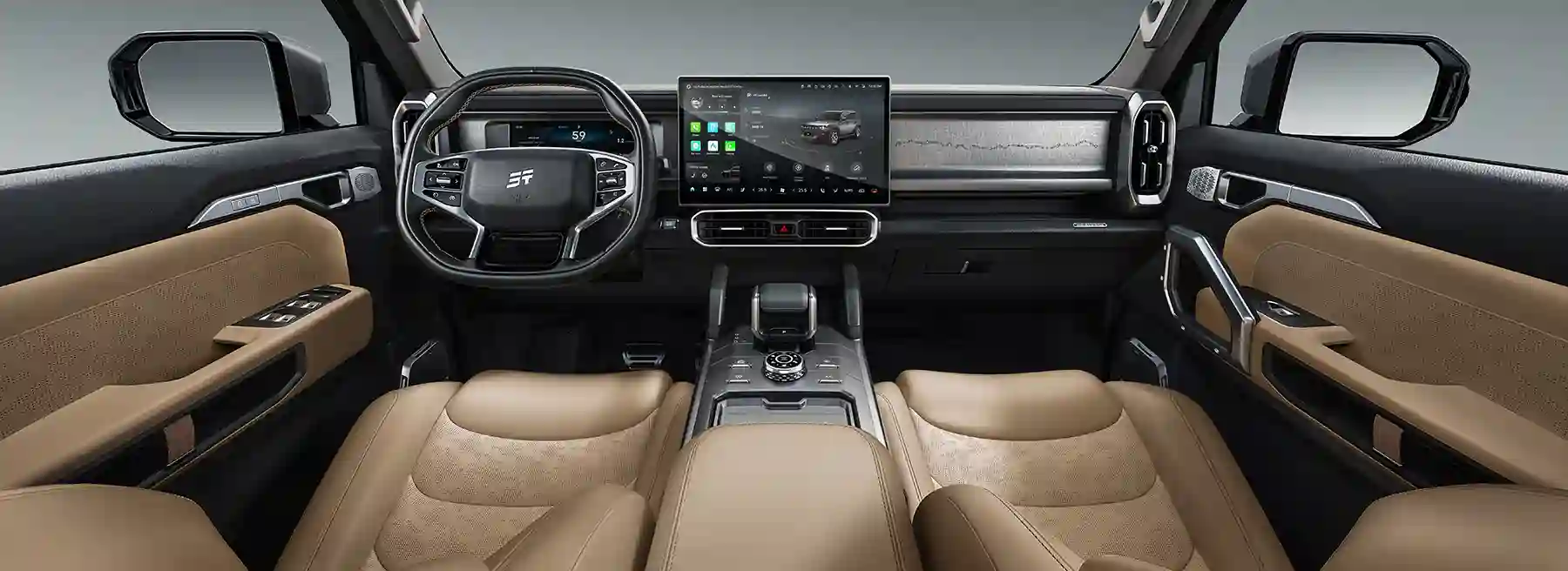 Внутреннее пространство T2 спроектировано с акцентом на эргономику и современные цифровые решения. Обзор интерьера выявляет использование премиальных материалов, таких как кожа и алькантара, что подчеркивает высокий статус автомобиля.